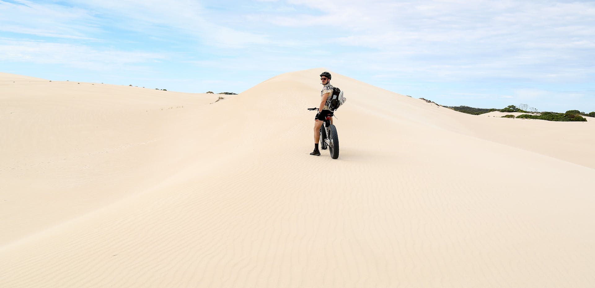Little Sahara's bike tours - the best tour on Kangaroo Island! Observe and learn about the island’s unique flora and fauna with your experienced guide. Wild koala sightings are guaranteed as you meander through the 500 year old gums before emerging out into the breathtaking landscape of the Little Sahara sand dunes! Glide along with your ultra wide low pressure tyres (and do it effortlessly if you opt for an e-bike). Riding down the dunes is an option for the thrill seekers!