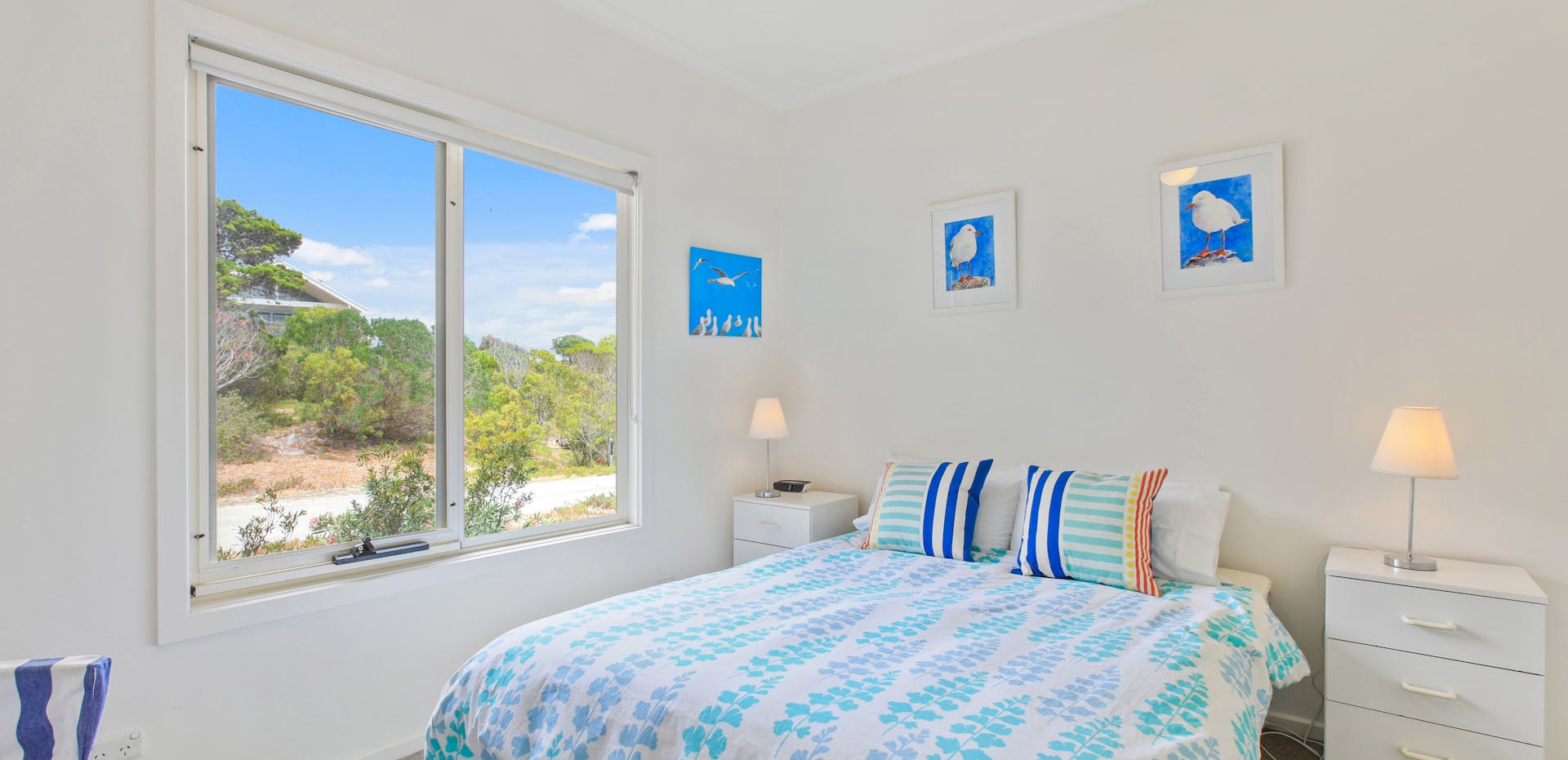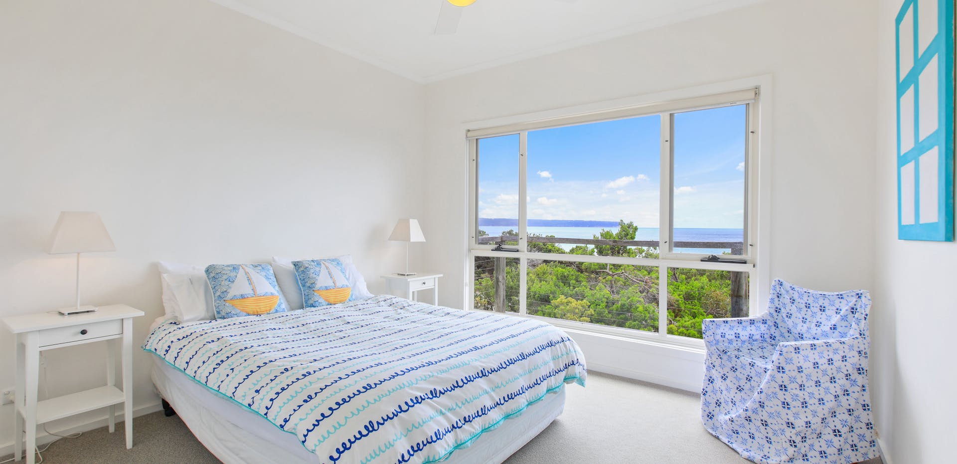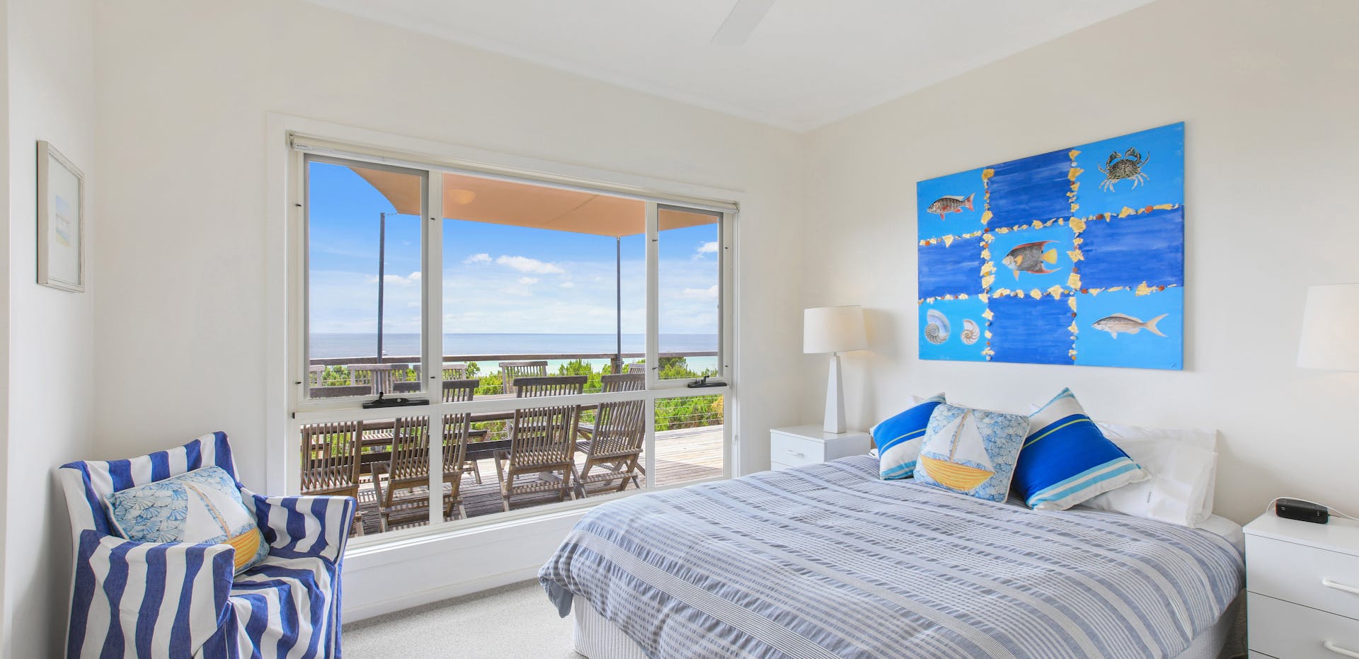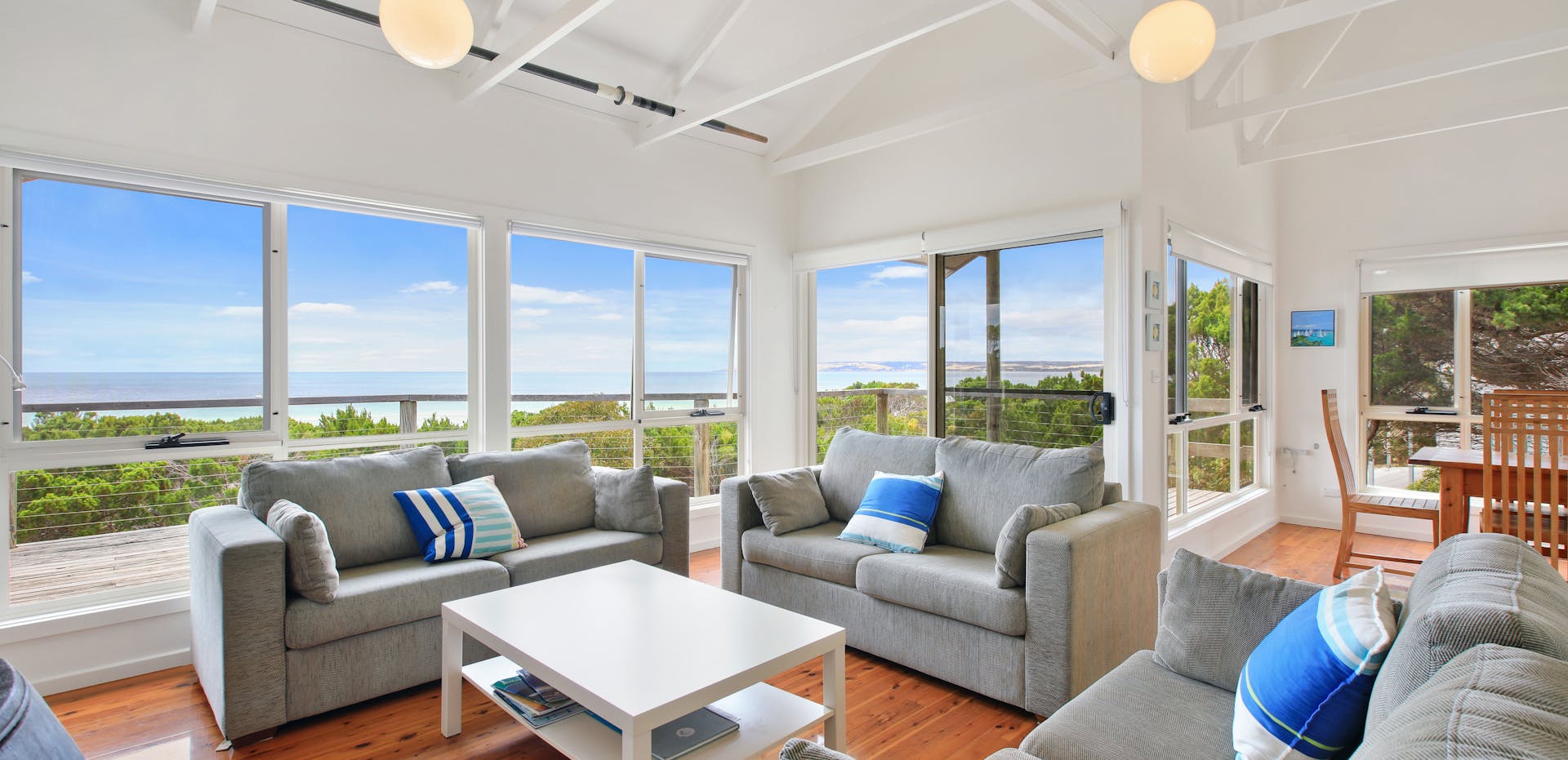 This comfortable, modern home has all the comforts of city living with the relaxed atmosphere of the country. The living area and two bedrooms overlooking the beach. Three bedrooms have queen beds, while the other bedroom has bunks that can sleep four guests. There are two bathrooms, one is an ensuite.