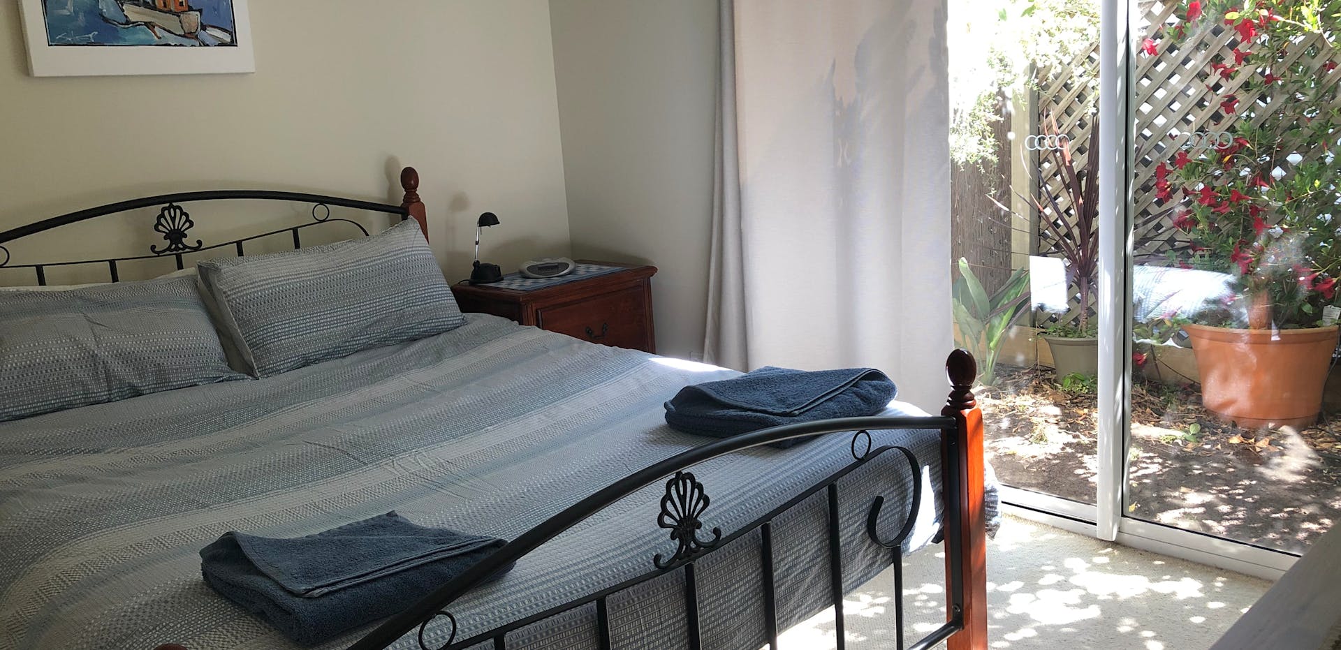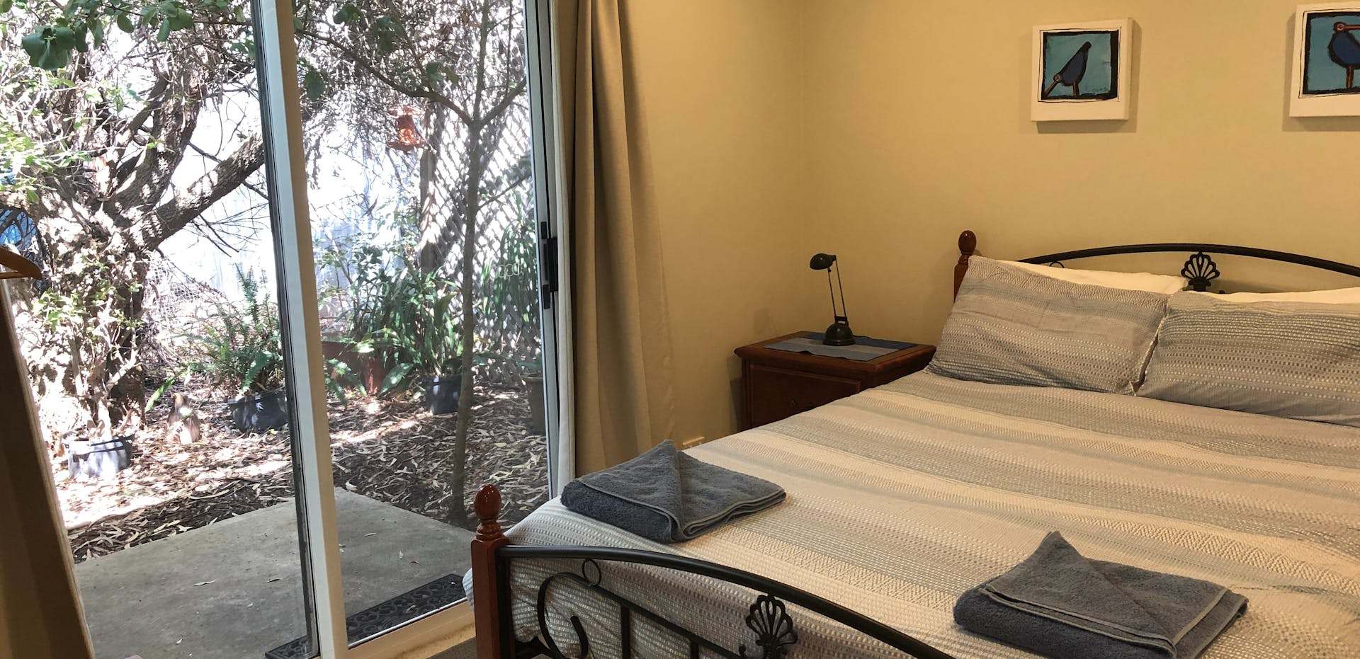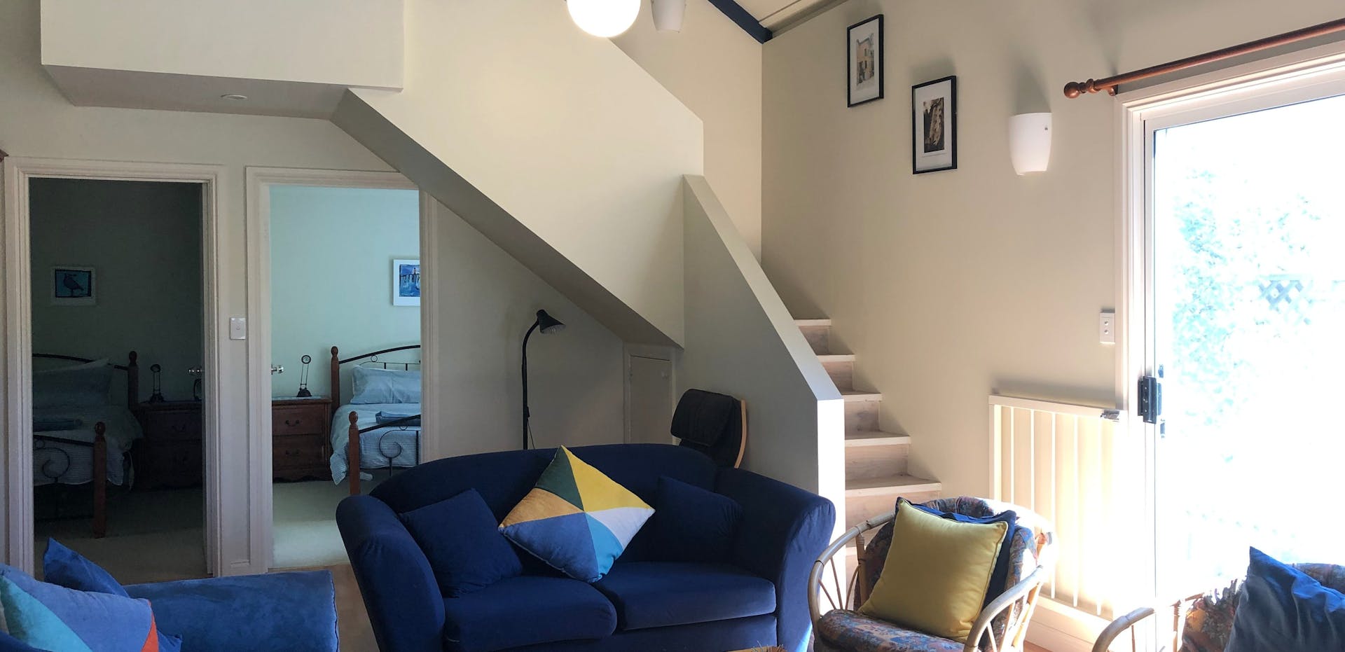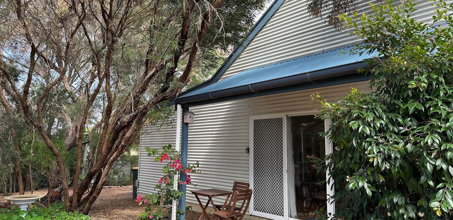 There are two queen bedrooms opening to the garden and an upstairs attic bedroom that kids love. You can sleep in while the kids play outside in the fully-fenced bush-garden.