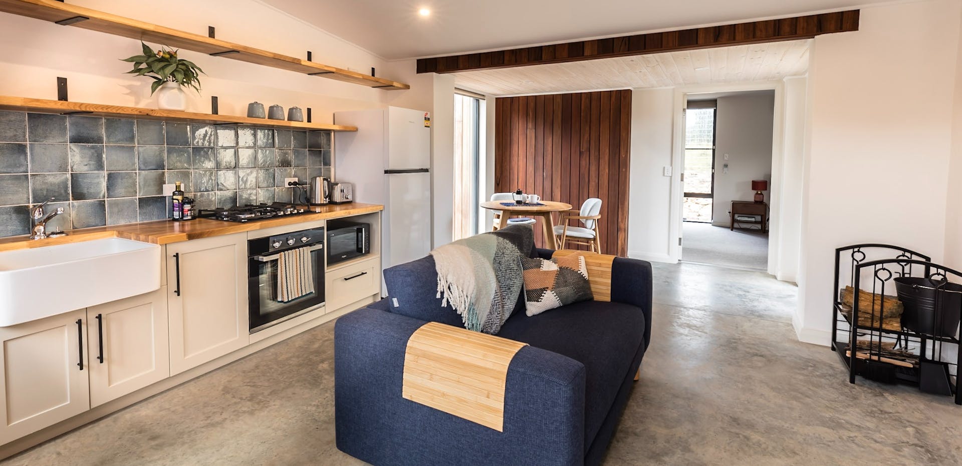 Enjoy outdoor dining on the large paved deck and gathering around the fire pit in the cooler months (fire restrictions apply), while Cape Barren geese and kangaroos graze just steps away.