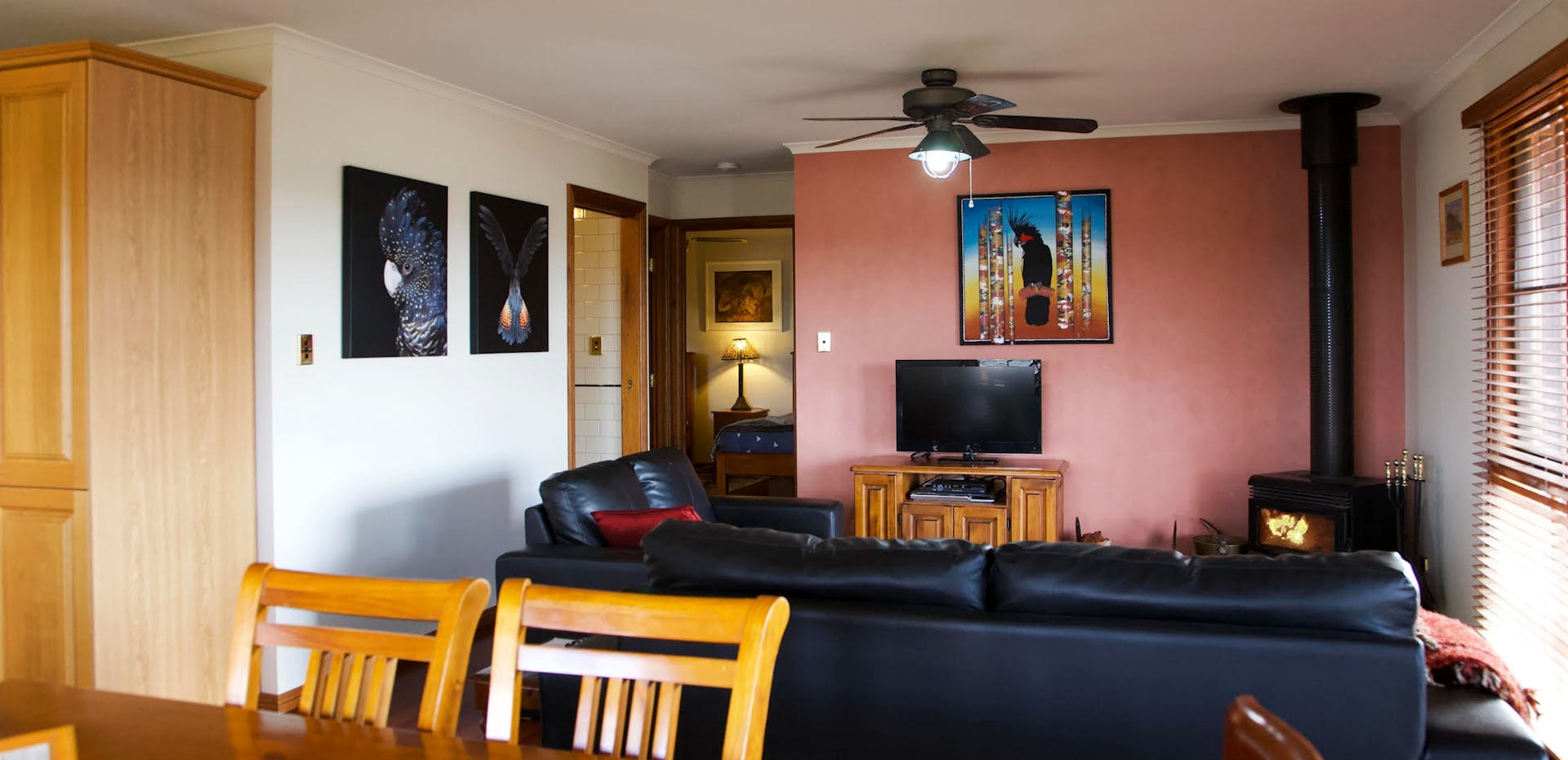 The classic log building has a gorgeous verandah, perfect to watch sunsets as the kangaroos graze the fields. The open plan design allows for the view to be enjoyed from every angle. Perfect for a couple or a family, up to six people can enjoy staying at the cottage. There are two rooms, counting with one queen-size bed, two single beds and a sofa bed in the living room.